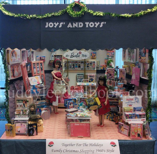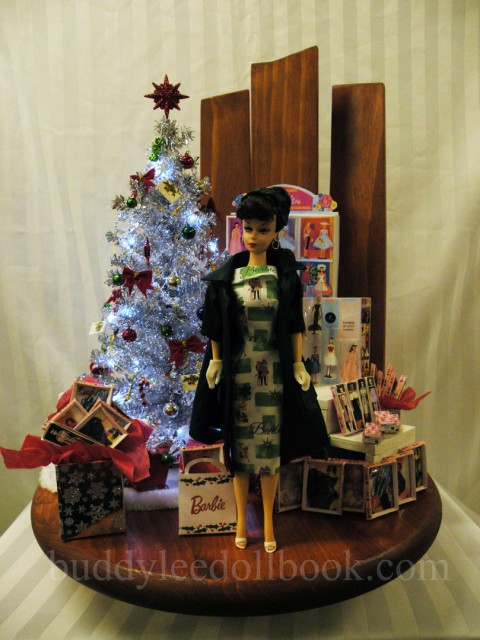 Christmas 1959 is the title of my new centerpiece that is being donated for a charity silent auction. Features new miniature counter displays, pink dressed boxed dolls, and rare NRFB outfits from 1959. Easter Parade outfit in Christmas green was designed and made by Debra Freeman. New miniatures will be availlable soon.